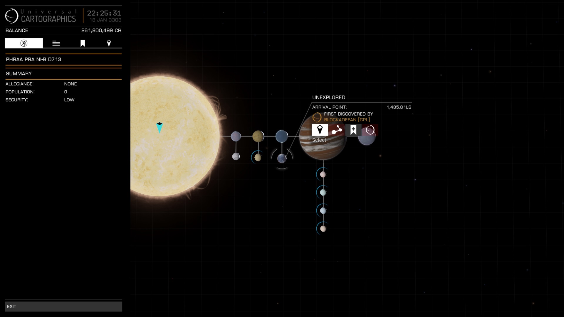 Nach Abgabe der Explorerdaten habe ich meinen Namen jetzt auch an das System gekritzelt, dass Sennemaa gefunden hatte. Gibt dort sehr viel Polonium und andere wertvolle Dinge. Obere Reihe gehört ihm, untere mir, also fest in GPL Hand:
