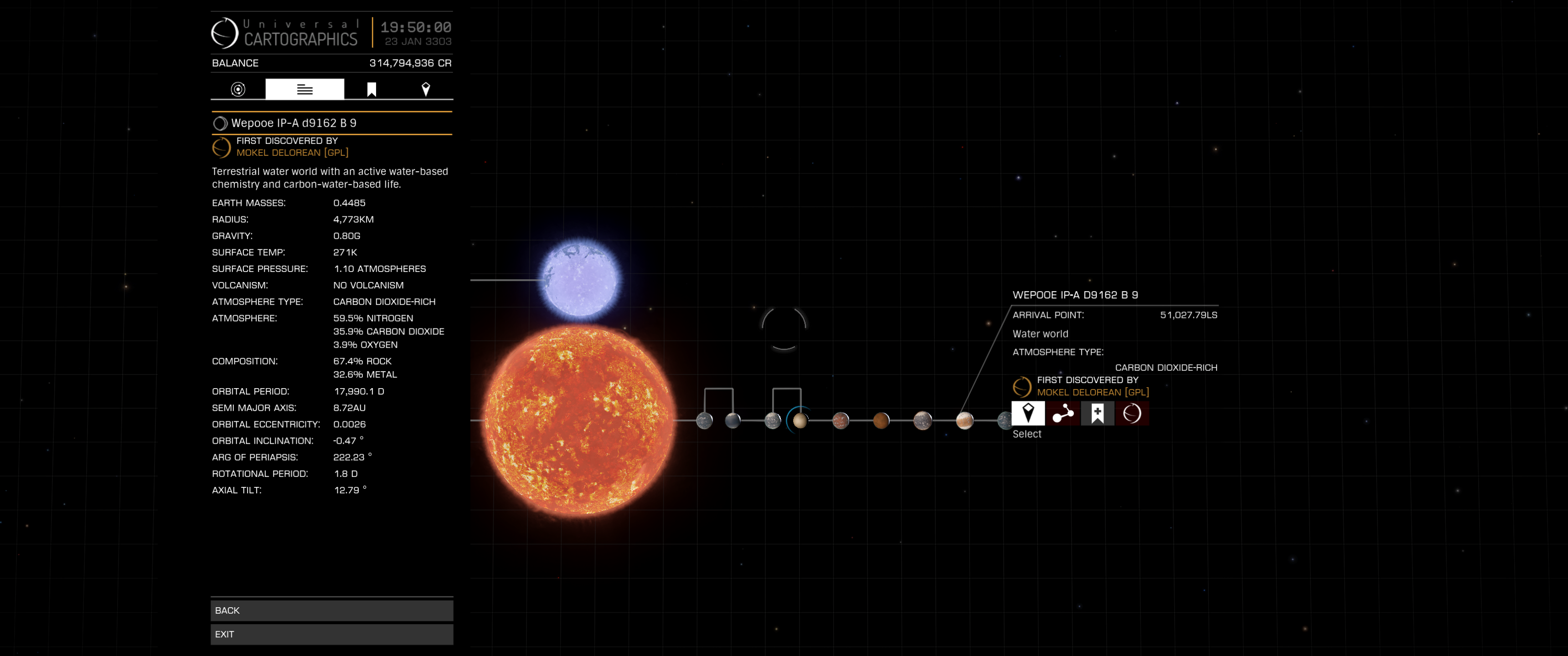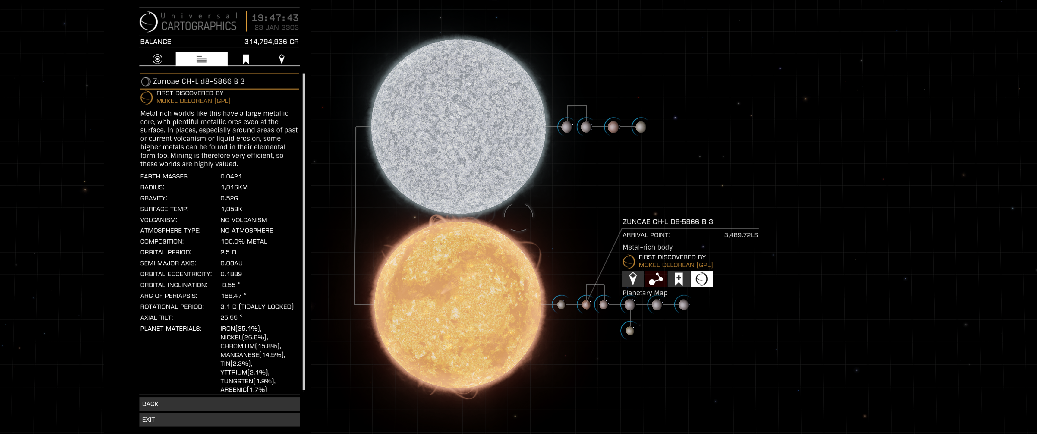 Und hier noch ein System, welches komplett mir gehört *har har har* (Gesamtwert fast 500 000 CR, fünf Wasserwelten und noch terraformierbare HMCs):