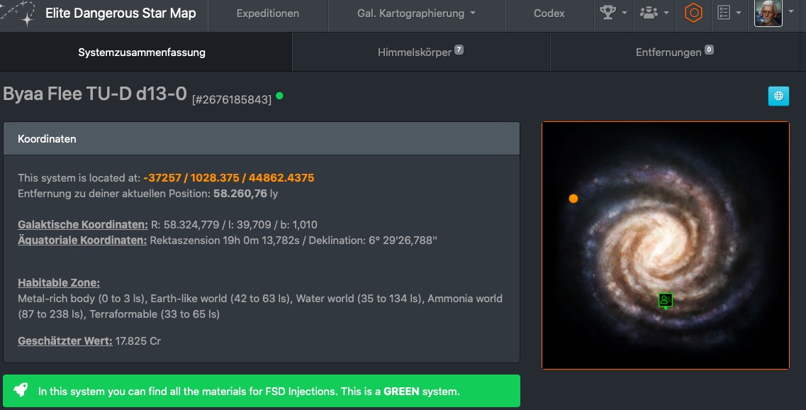 Ich stehe, Stand 13.1. 70 Sprünge vor Sag A, dass Erfassen der Systeme hält leider etwas auf, insbesondere weil doch ab und an Wasserwelten, erdähnliche etc. dabei sind. 1.2. Colonia halte ich Stand heute aber für machbar. Werde erst einmal alle Explorerdaten abgeben und eventuell noch ein wenig umkonfigurieren aber nur, wenn ich dadurch tatsächlich mehr Reichweite bekomme.