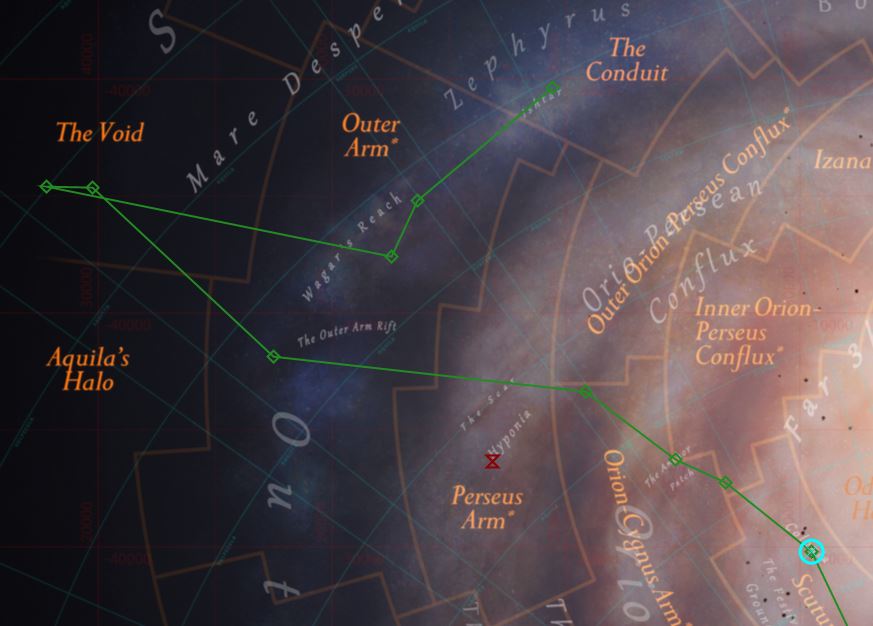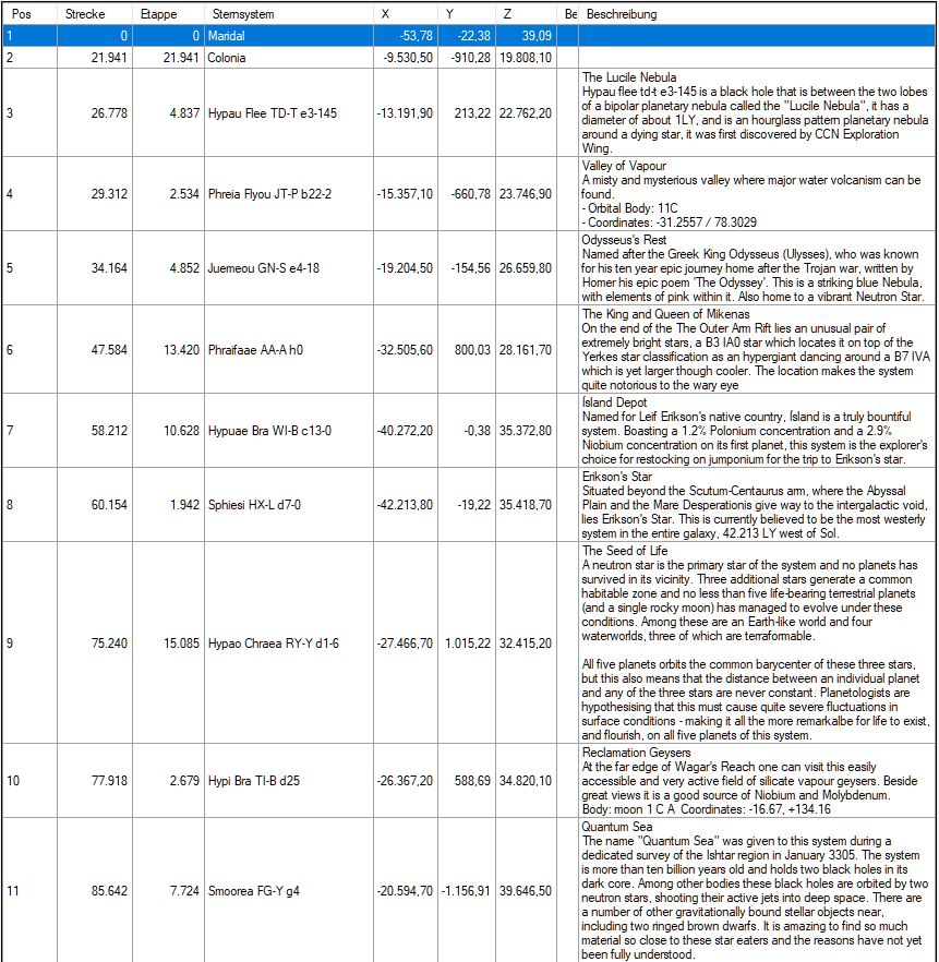 Ich habe mir ein paar Gedanken zu einer Reiseroute gemacht. Die Idee ist einen gemeinsamen Startpunkt (Colonia) zu definieren und als primäres Ziel Erikson's Star, das westlichste bekannte System, zu erreichen. Danach führt der Weg über Wagar's Reach nach Ishar. Dort kann jeder entscheiden, ob er weiter Richtung Norden will, um die 65k zu knacken oder woanders hin will. Dazwischen liegen ein paar Wegpunkte, an denen wir uns sammeln können. Das Ganze ist als ein Vorschlag zur Diskussion zu sehen.