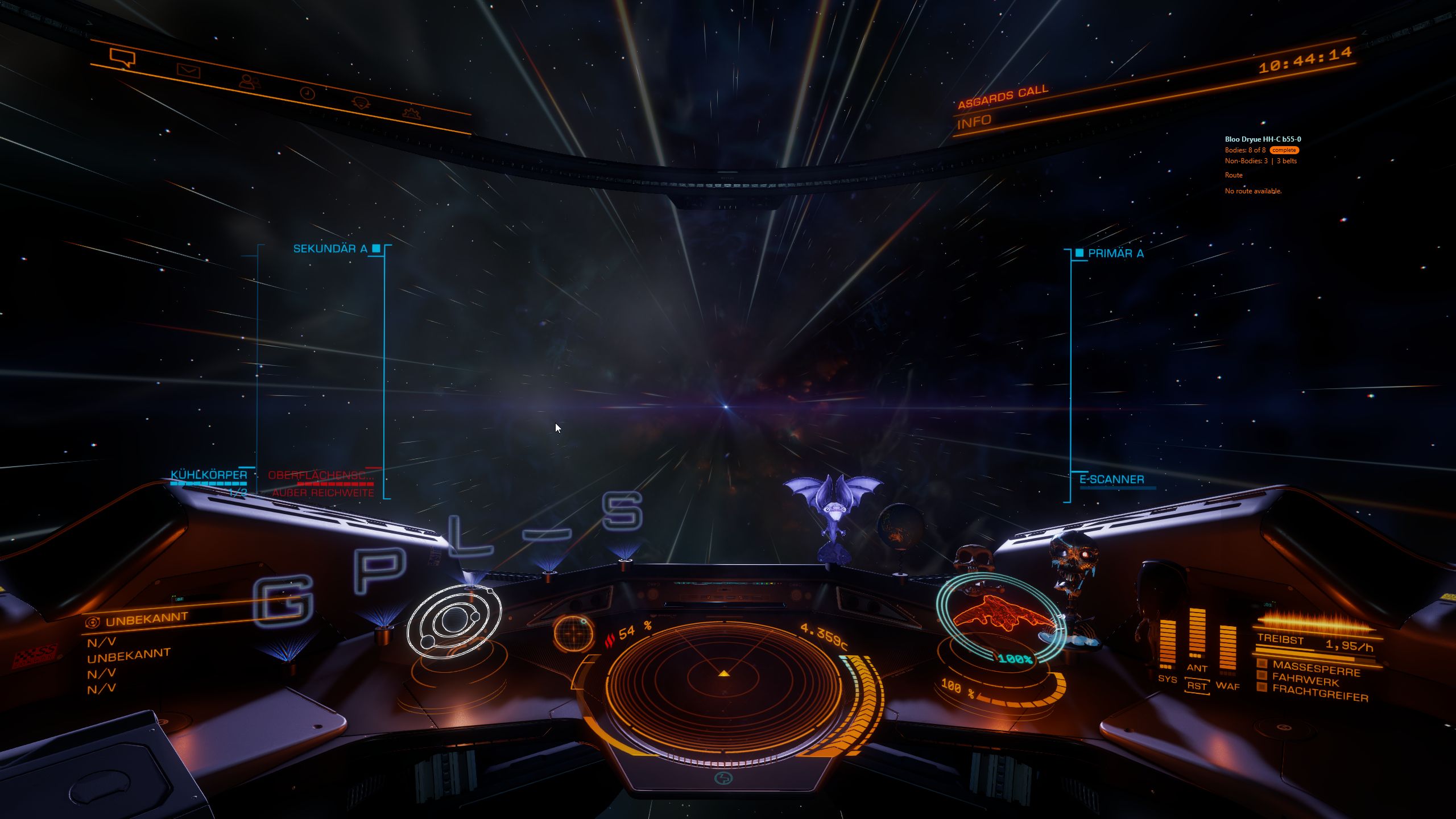 Ich habe ĂŒblicherweise einen Wackelkopf, unser Goldabzeichen, die Erde und einen Thargoiden dabei. Im Oktober habe ich dann noch Halloween-Deko und ab Ende November Weihnachtsdeko dabei. Und hier bin ich gerade auf dem Sprung zu Ulliversum's Star, den habe ich vor kurzem besucht.